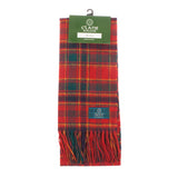 CLANS OF SCOTLAND Lambswool Clan Tartan Scarf. Timeless and traditional, this beautifully crafted tartan scarf is made from pure lambswool. The use of finest material makes it an exquisite garment with an extra-soft finish. The packaging includes a clan history and motto at the back. This scarf is a fantastic souvenir from Scotland either for yourself or your beloved ones.