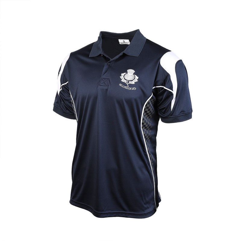 Men's Racing Polo shirt in Navy with Thistle embroidery on the front. Great for a casual day out.